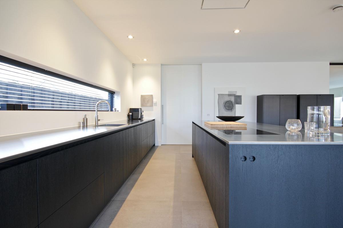 Greeploze keuken uit geborsteld eiken fineer gespoten in ral 9005. Fronten te openen dmv greeplijsten en push to open. Hoge kastenwand uitgevoerd in Egger perfect mat wit