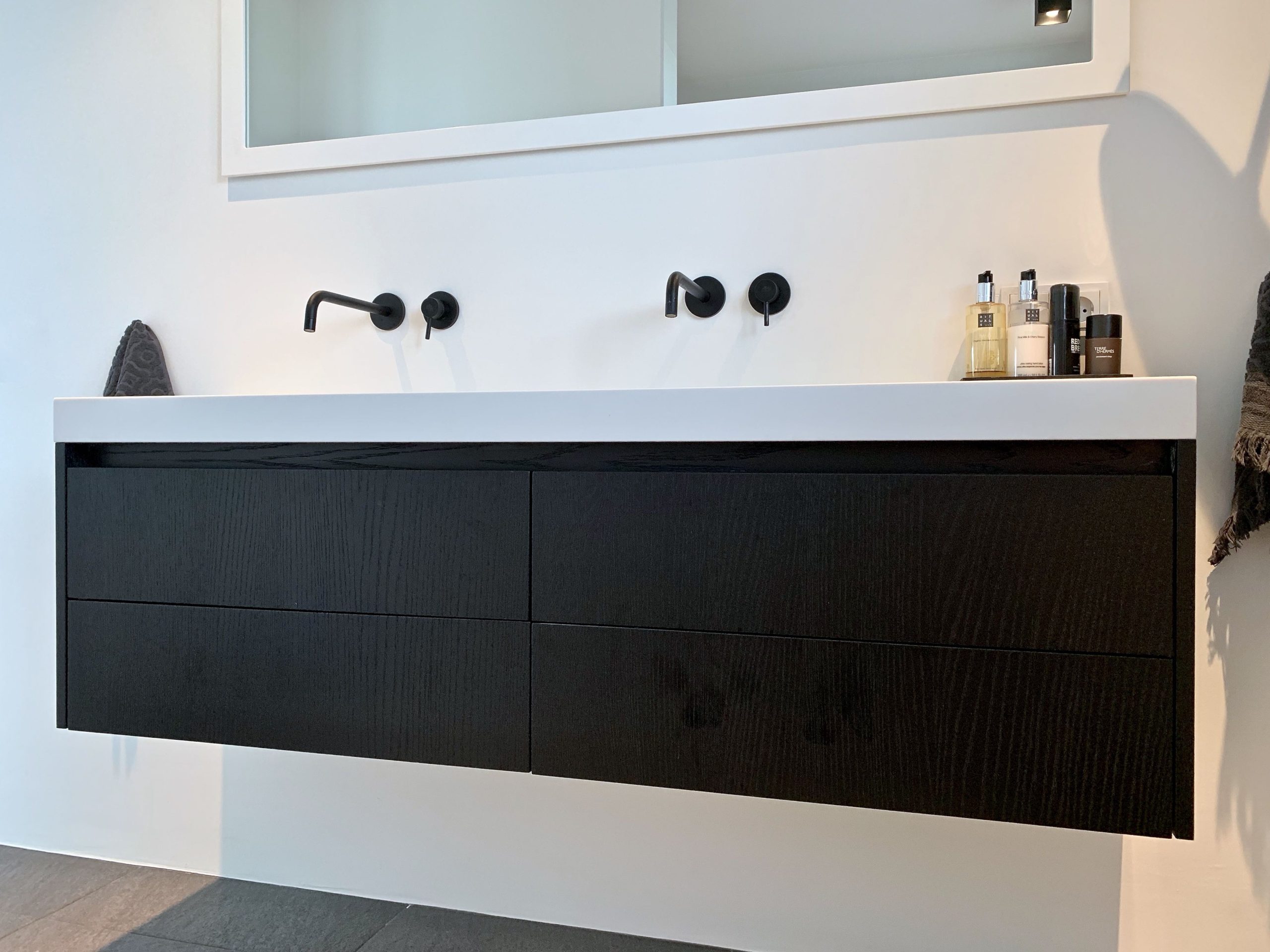 Extra groot badmeubel strak tussen twee muren in.Dit waanzinnige badmeubel is gemaakt van massief eikenhout met een dik Hi-Macs blad in de kleur S028.Het badmeubel is zo gemaakt dat de nerf op de ladefronten van links naar rechts doorloopt.